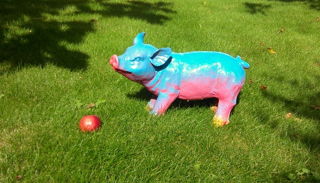 Echappé d’un album de « Peyo », il goûte la vie dans un jardin en se nourrissant de pommes. Heureusement non certifié « Ibérico », il ne finira pas en « pata negra »