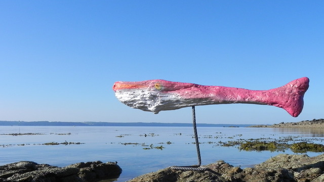 Échouée sur la grève, revenue à la vie par la magie de la peinture, la Baleine rose regarde à nouveau vers le large
